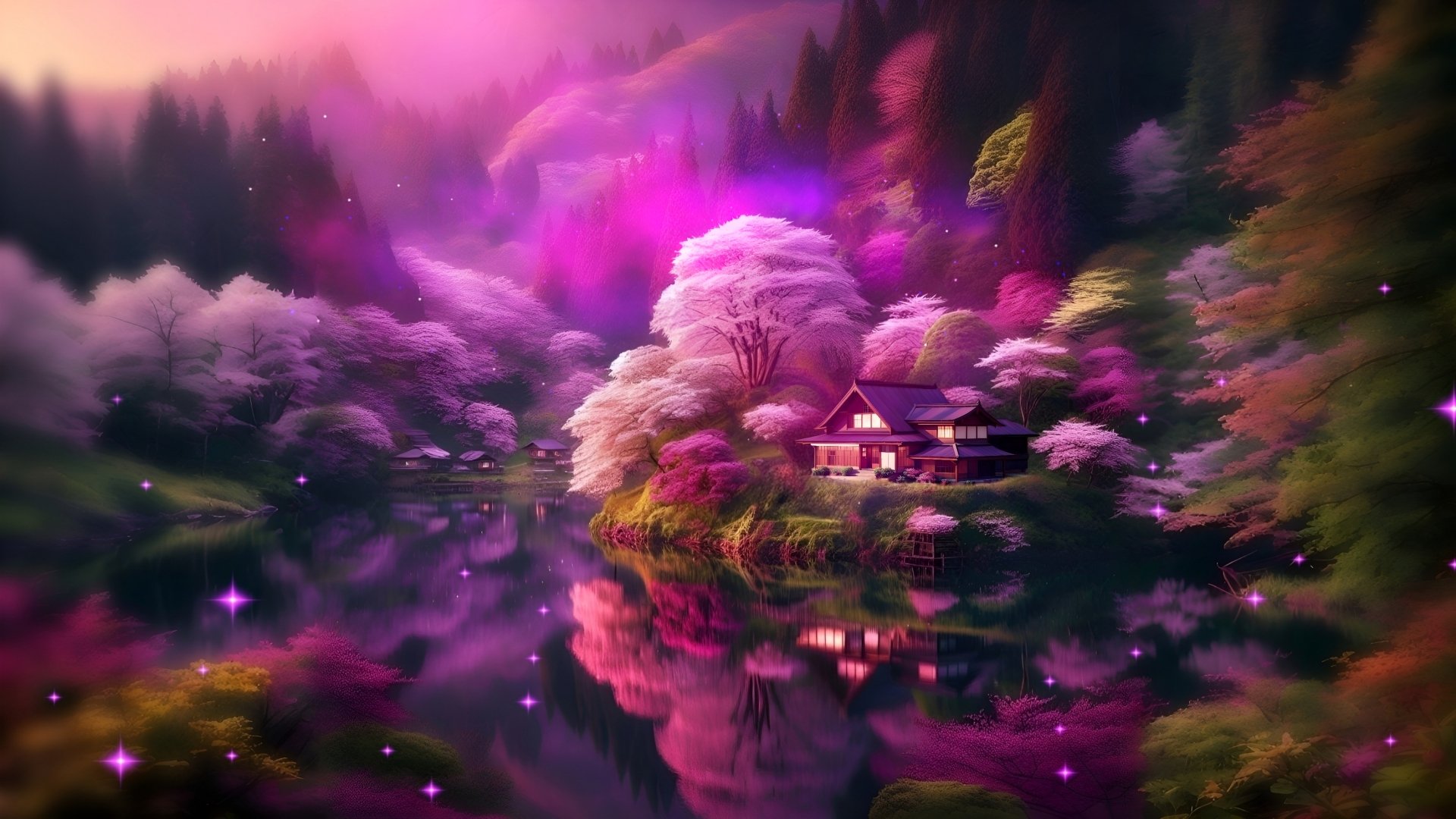 dreamy view of house in fantasy japan, darkmode sunset style, just wallpaper and theme really