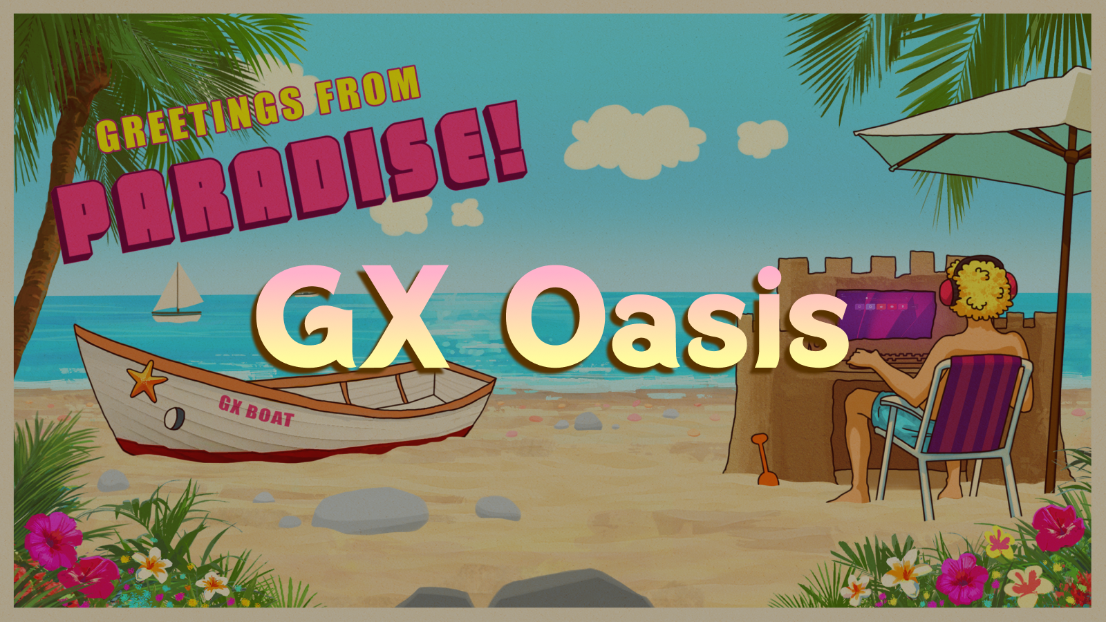 Here's the perfect spot for digital nomads - a beach, a computer in a sandcastle, and a "GX BOAT". Remote gaming has never been so paradisiacal!